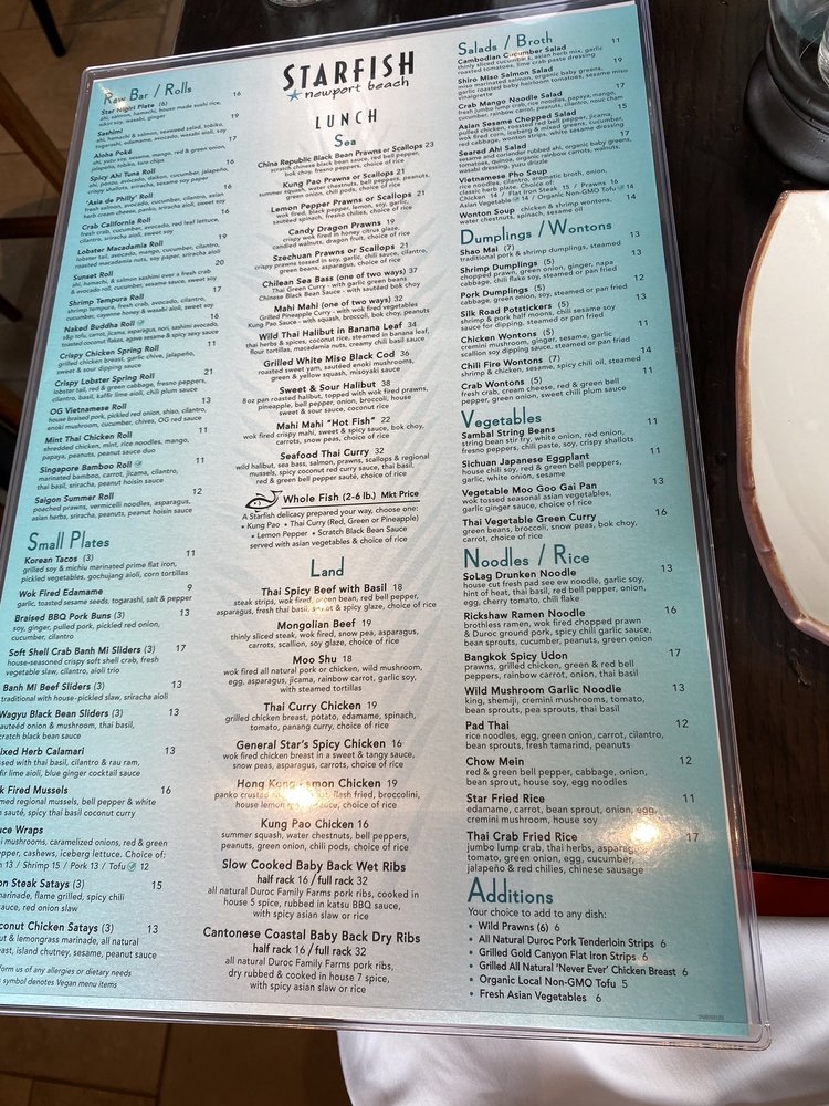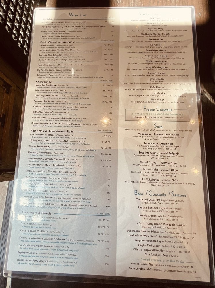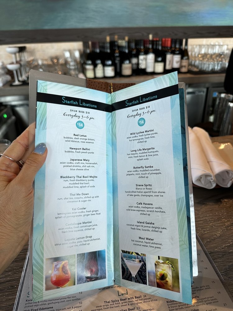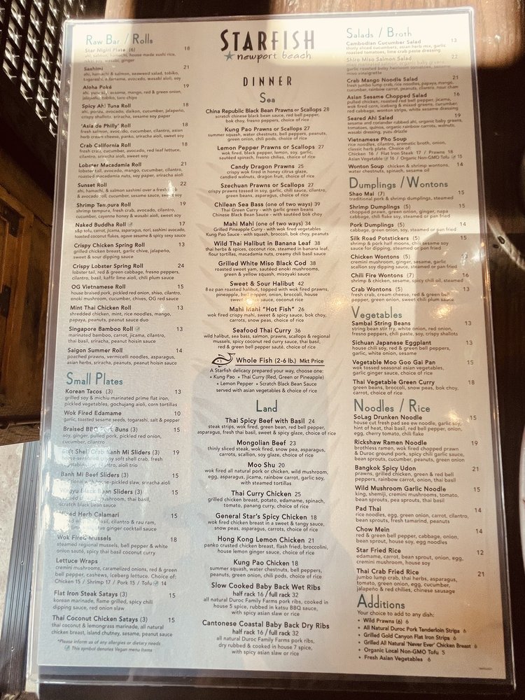 Starfish Newport Beach is a trendy Asian fusion restaurant offering a mix of Thai and sushi dishes. Located in Newport Beach, CA, this classy establishment provides a variety of amenities such as waiter service, happy hour specials, and outdoor seating. Customers praise the excellent customer service and delicious cocktails, making it a perfect place for special occasions or catching up with friends. The menu features a range of options, including small plates like Peking Duck Bao buns, Korean tacos, and Bahn mi sliders, which are referred to as Asian tapas and perfect for sharing. The fresh and flavorful dishes, such as the chicken lettuce wraps and sushi, leave a lasting impression on diners. With a cool vibe and knowledgeable staff, Starfish Newport Beach is a must-visit destination for those seeking a unique dining experience with a modern twist.